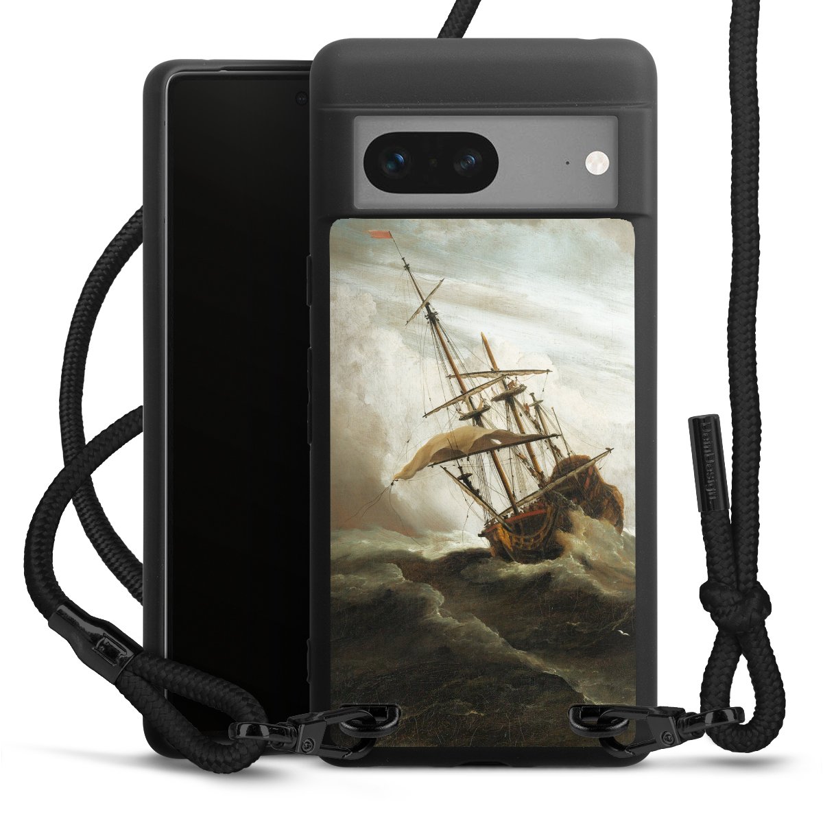 Pure Black: Handyhülle, Stoffband und Metalldetails in stylischem Mattschwarz.