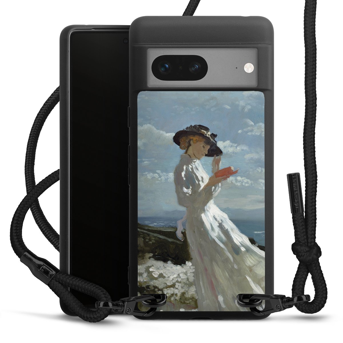 Pure Black: Handyhülle, Stoffband und Metalldetails in stylischem Mattschwarz.