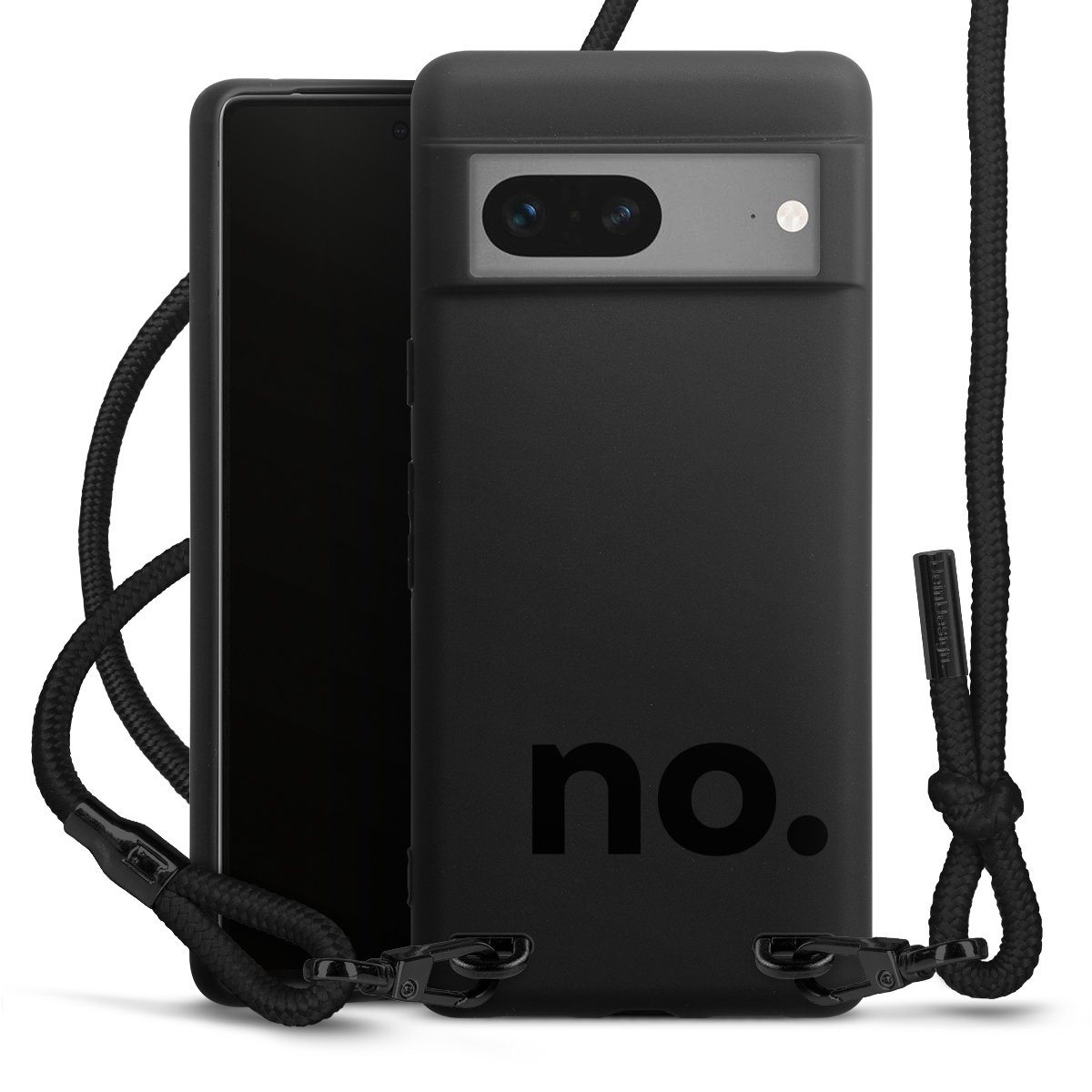 Pure Black: Handyhülle, Stoffband und Metalldetails in stylischem Mattschwarz.
