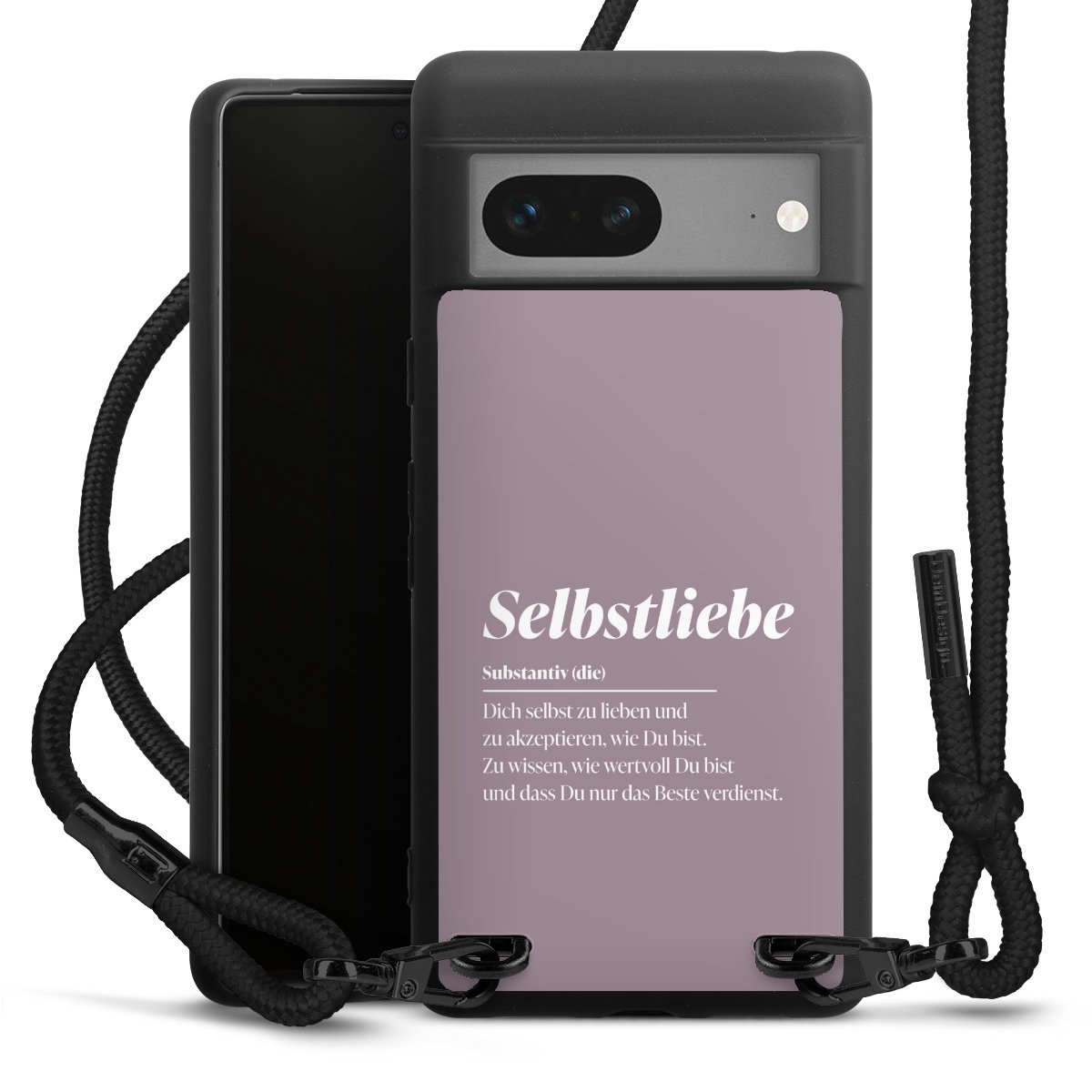 Pure Black: Handyhülle, Stoffband und Metalldetails in stylischem Mattschwarz.