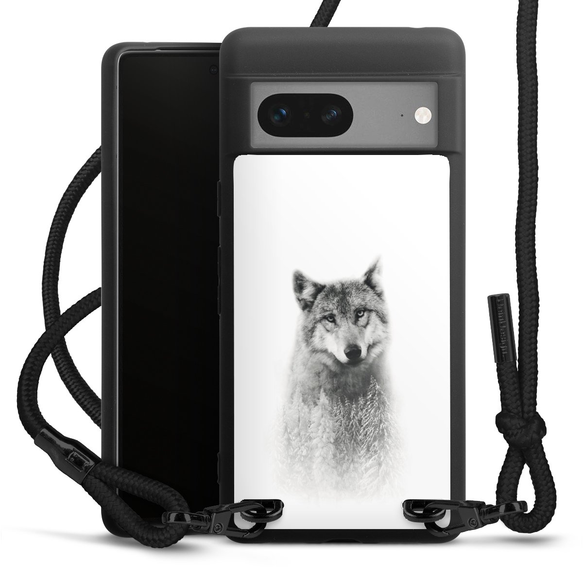 Pure Black: Handyhülle, Stoffband und Metalldetails in stylischem Mattschwarz.