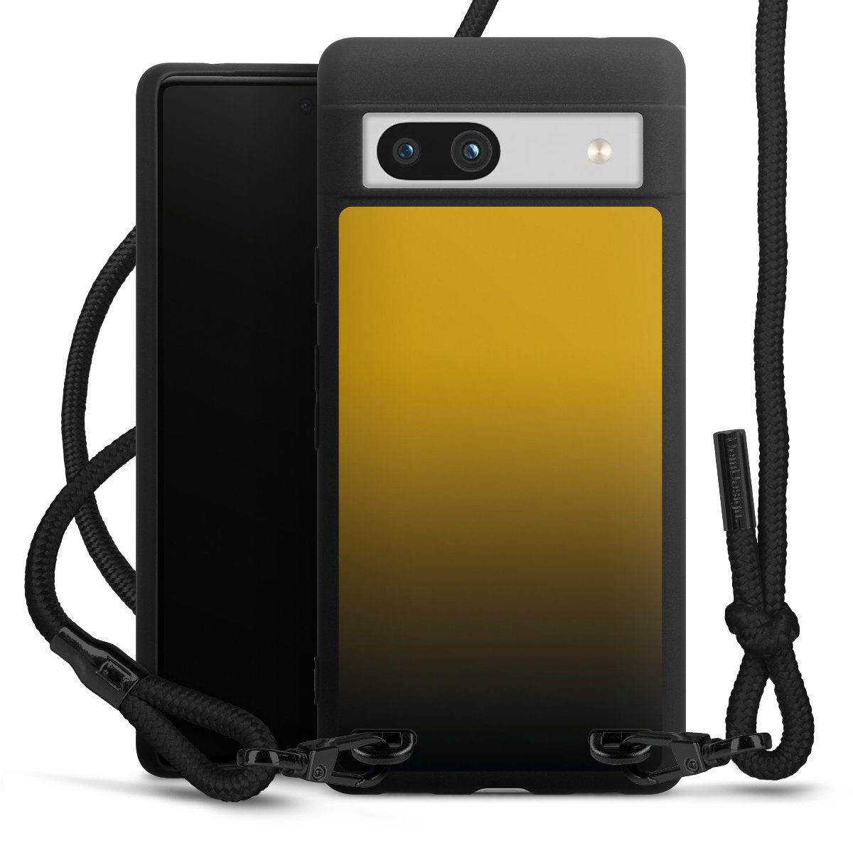Pure Black: Handyhülle, Stoffband und Metalldetails in stylischem Mattschwarz.