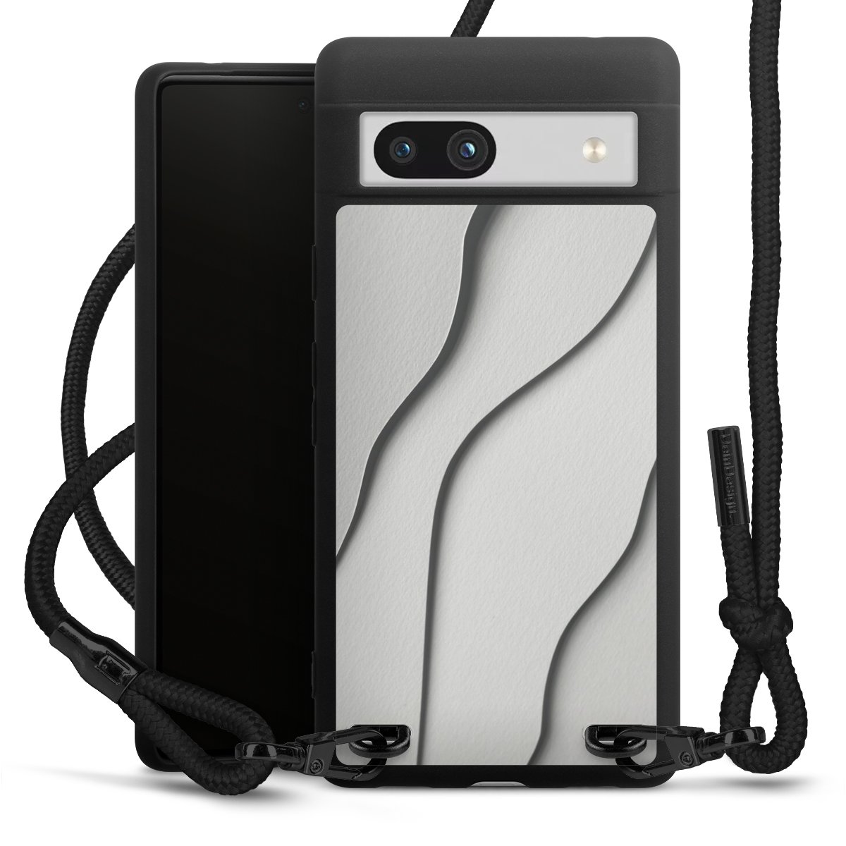 Die mattschwarze Silikonhülle besteht aus flexiblen TPU (thermoplastisches Polyurethan) und bietet robusten Schutz. Durch das langlebige, bruchsichere Material ist die Hülle biegsam und formbeständig zugleich. Die matte Oberfläche lässt Dein Design besser zur Geltung kommen und ist weniger anfällig für Fingerabdrücke und Schmutz. Das stylische Trend-Accessoire liegt griffig in der Hand und wird optimal von der Handykette aus Stoff (Polyester) ergänzt. Das geflochtene Stoffband ist ca. 1,70 Meter lang mit einem Durchmesser von ca. 0,5cm. Aufgrund der besonderen Knotentechnik ist das Band durch einfaches Ziehen in der Länge verstellbar. Als kleines i-Tüpfelchen haben wir das Band mit schicken Metall-Verschlüssen in Mattschwarz versehen.