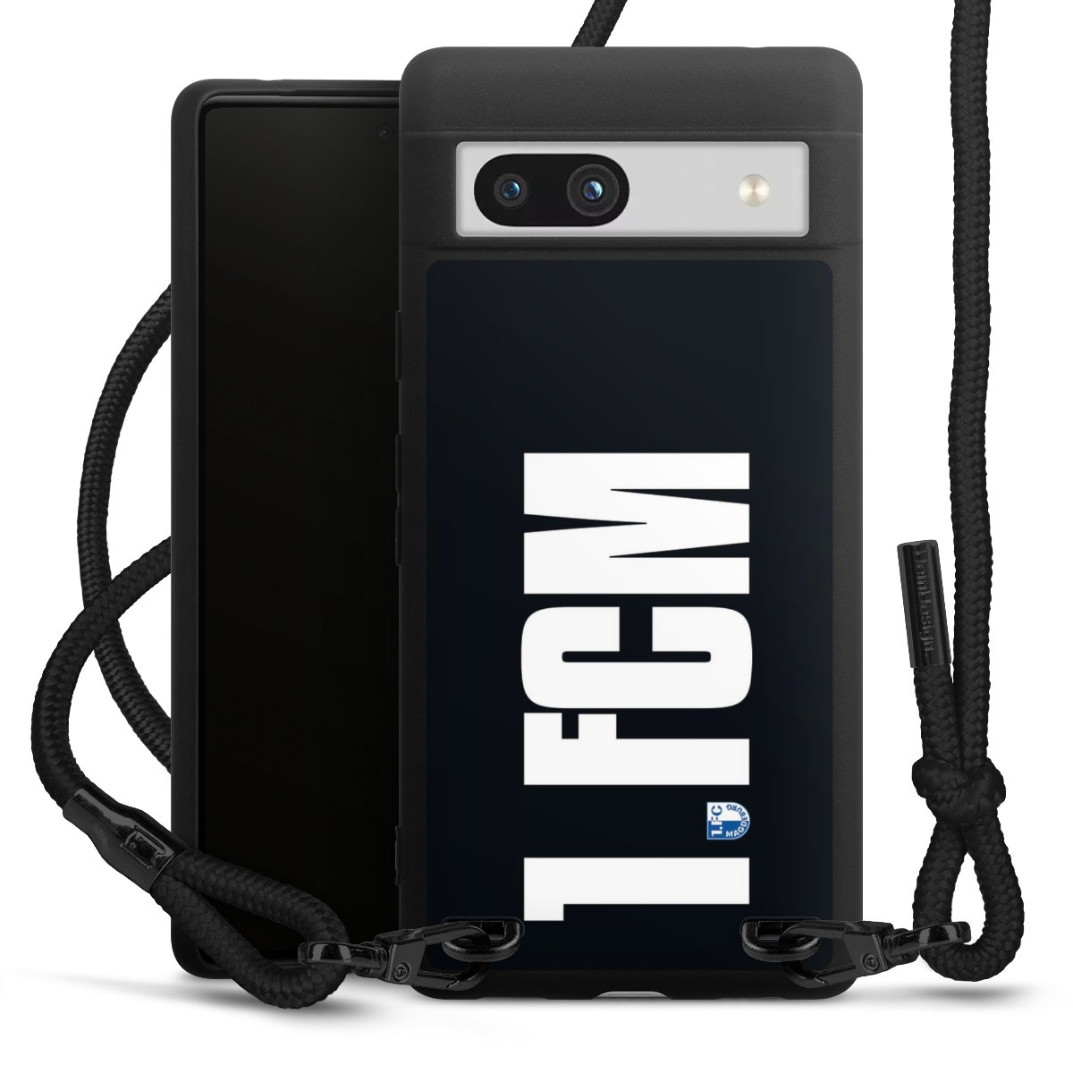 Pure Black: Handyhülle, Stoffband und Metalldetails in stylischem Mattschwarz.