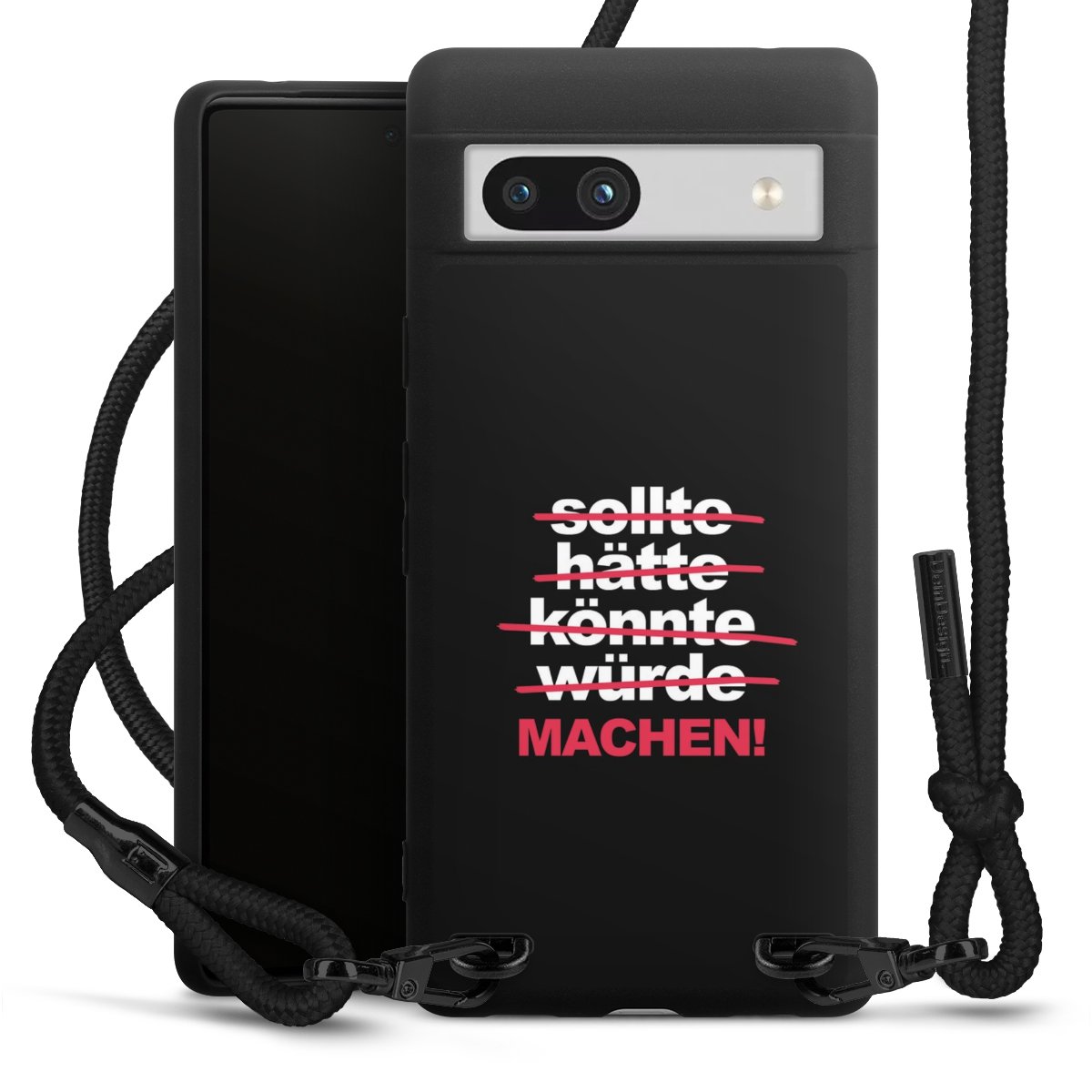 Pure Black: Handyhülle, Stoffband und Metalldetails in stylischem Mattschwarz.