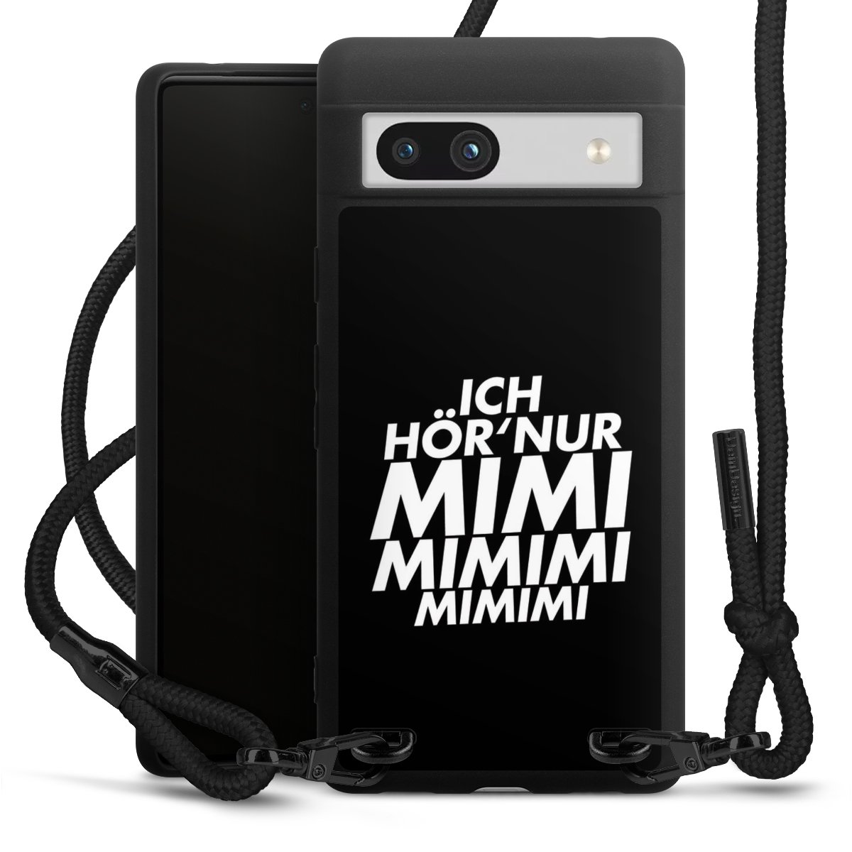 Pure Black: Handyhülle, Stoffband und Metalldetails in stylischem Mattschwarz.
