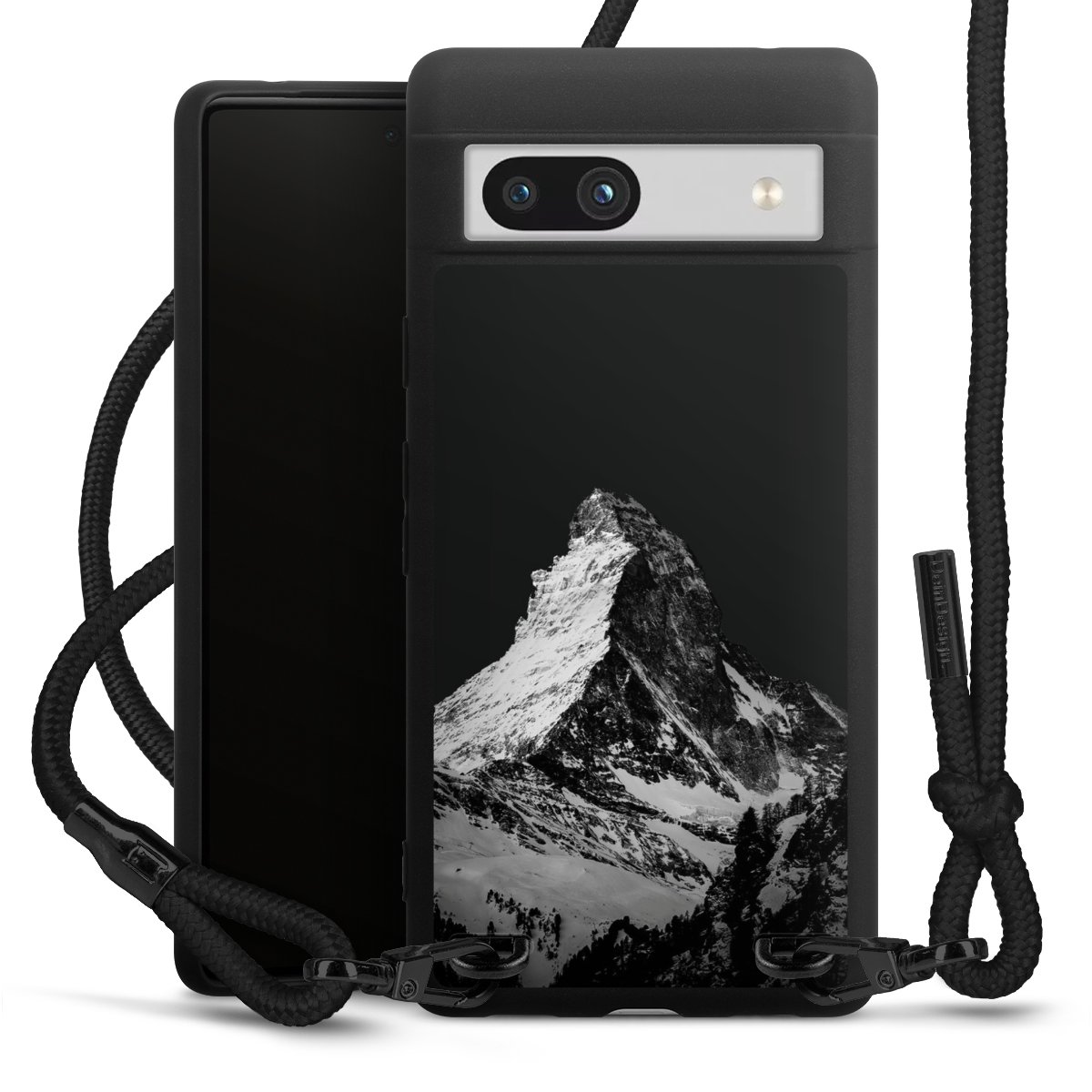 Pure Black: Handyhülle, Stoffband und Metalldetails in stylischem Mattschwarz.
