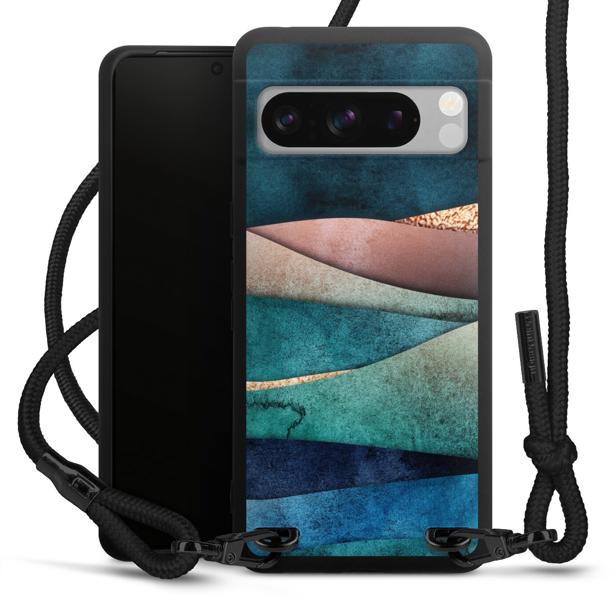 Pure Black: Handyhülle, Stoffband und Metalldetails in stylischem Mattschwarz.