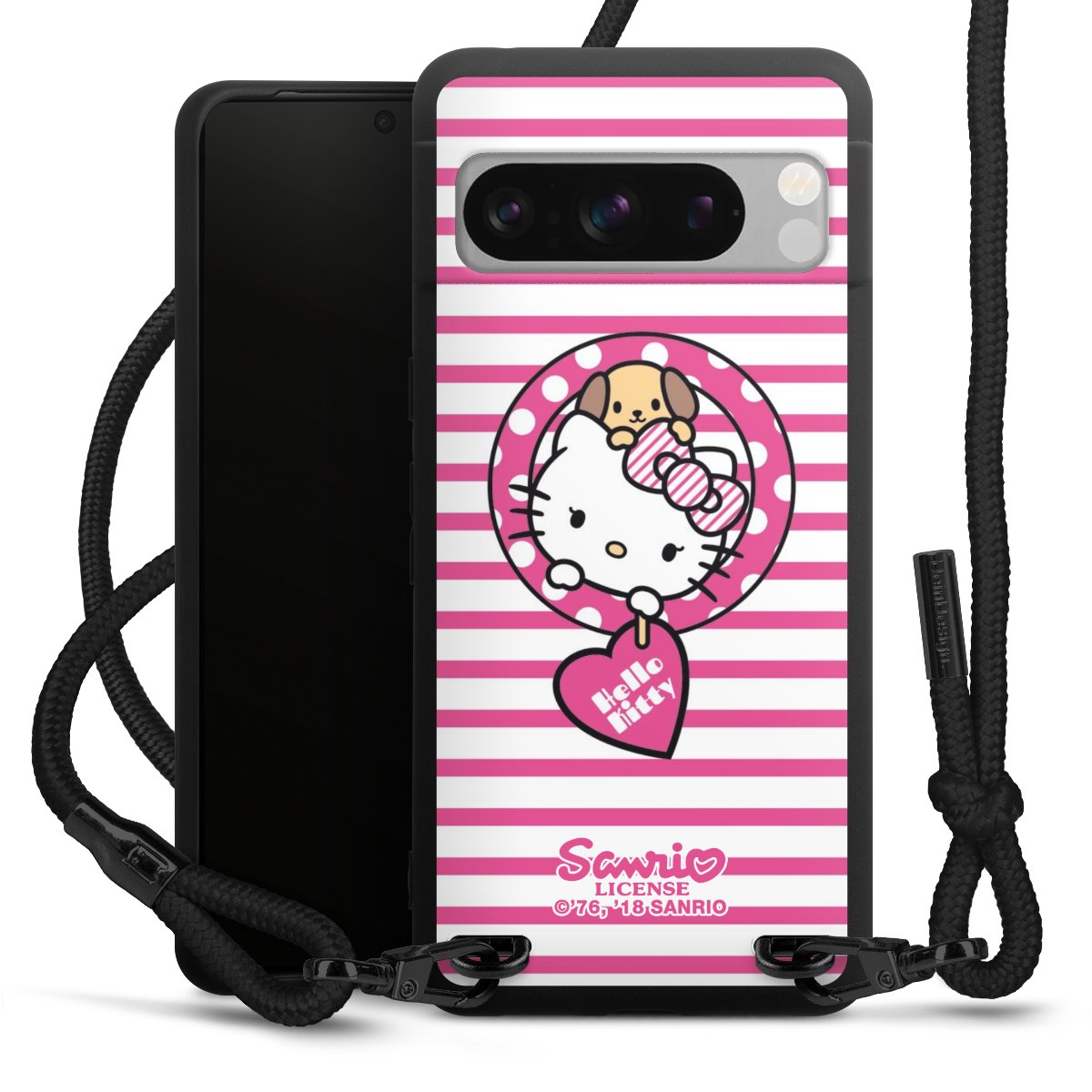Pure Black: Handyhülle, Stoffband und Metalldetails in stylischem Mattschwarz.