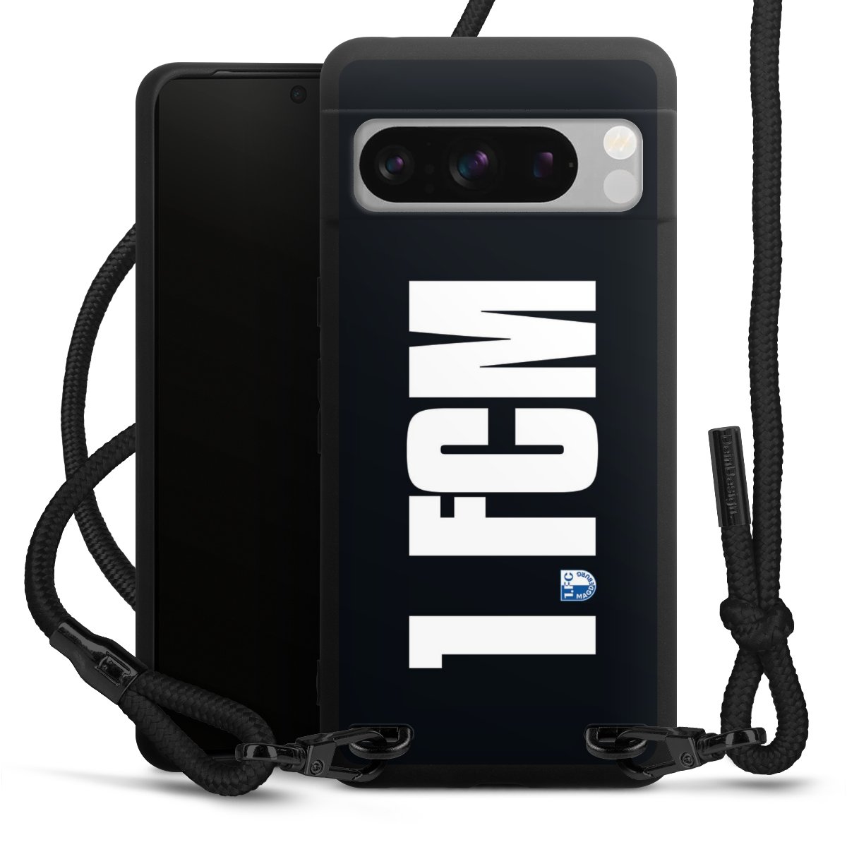 Pure Black: Handyhülle, Stoffband und Metalldetails in stylischem Mattschwarz.
