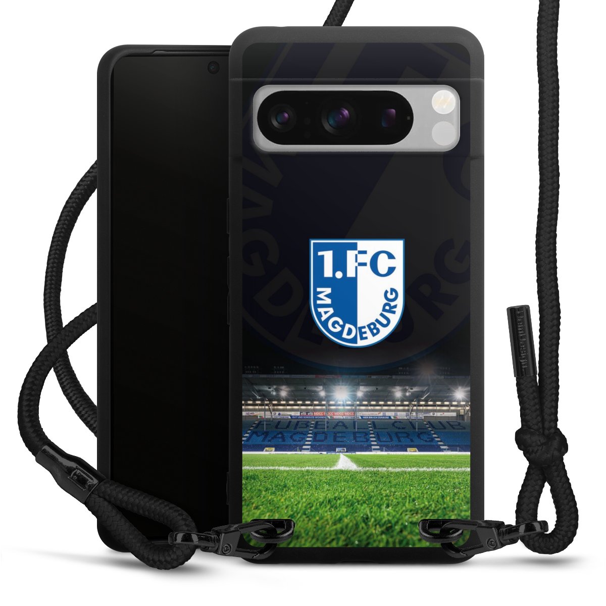 Pure Black: Handyhülle, Stoffband und Metalldetails in stylischem Mattschwarz.