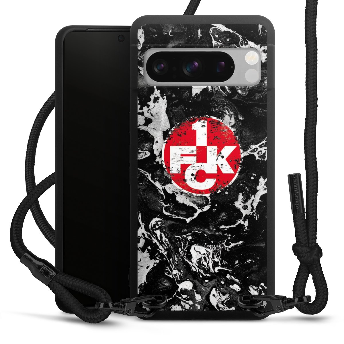Pure Black: Handyhülle, Stoffband und Metalldetails in stylischem Mattschwarz.