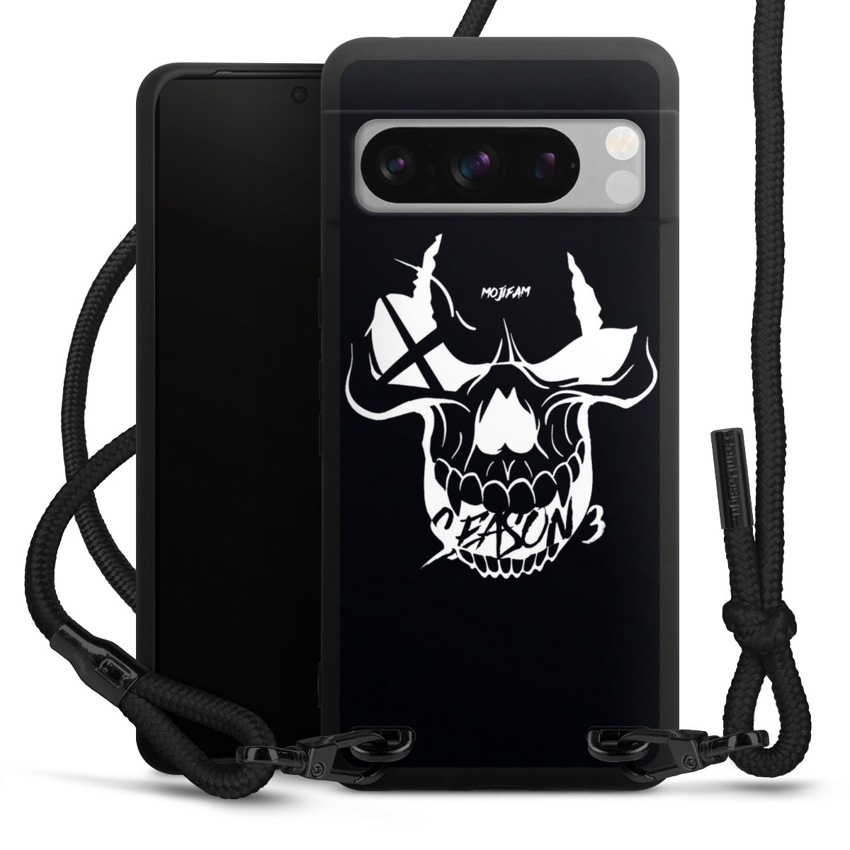 Pure Black: Handyhülle, Stoffband und Metalldetails in stylischem Mattschwarz.