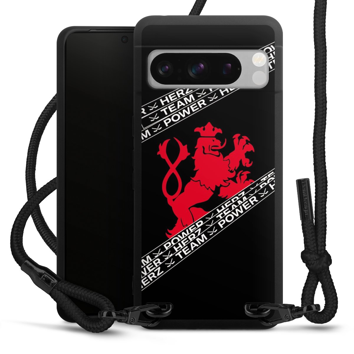 Pure Black: Handyhülle, Stoffband und Metalldetails in stylischem Mattschwarz.