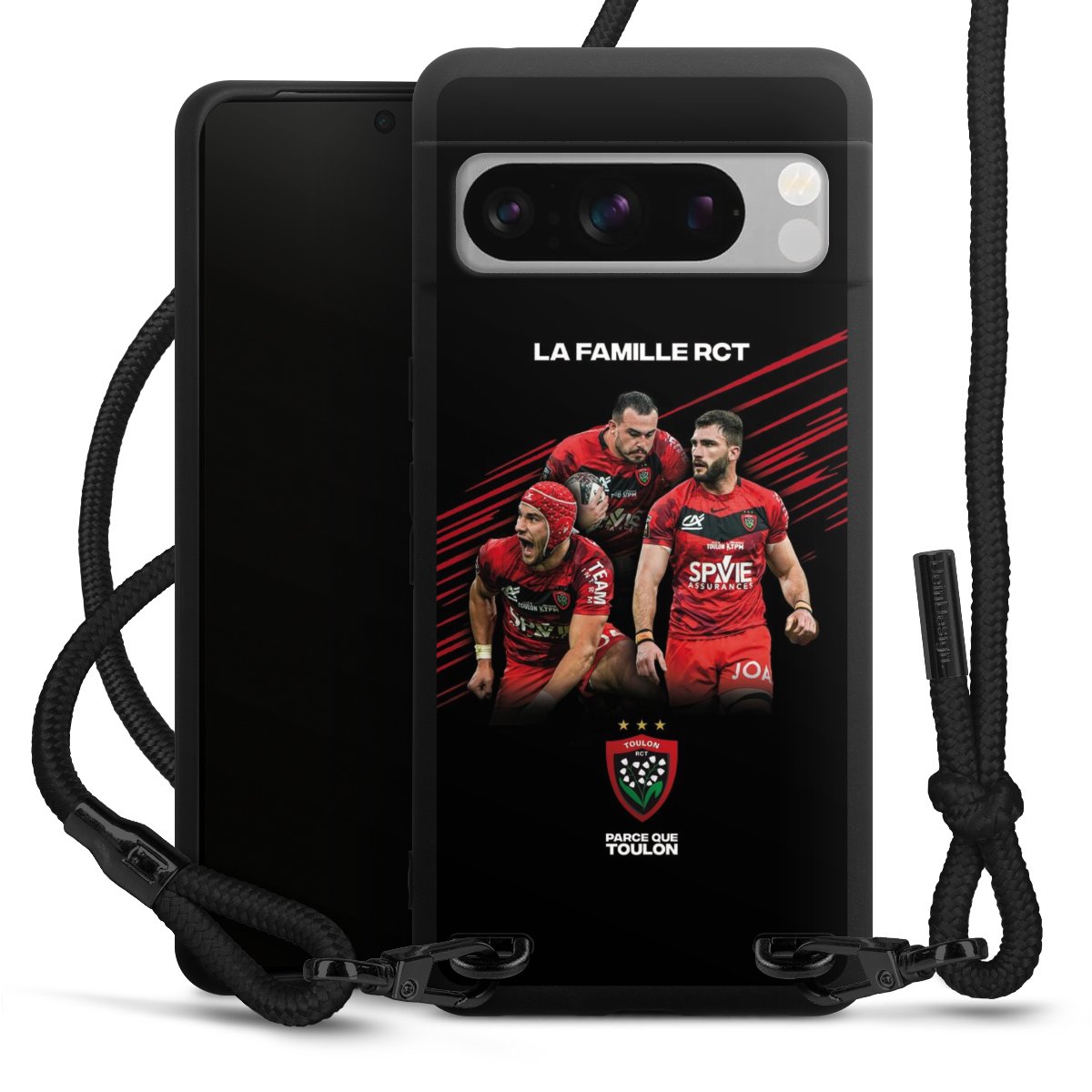 Pure Black: Handyhülle, Stoffband und Metalldetails in stylischem Mattschwarz.