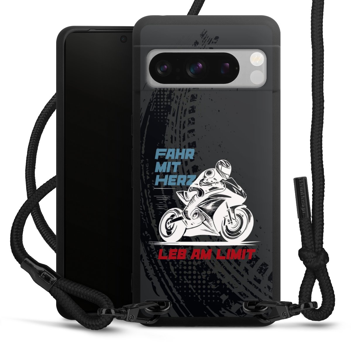Pure Black: Handyhülle, Stoffband und Metalldetails in stylischem Mattschwarz.