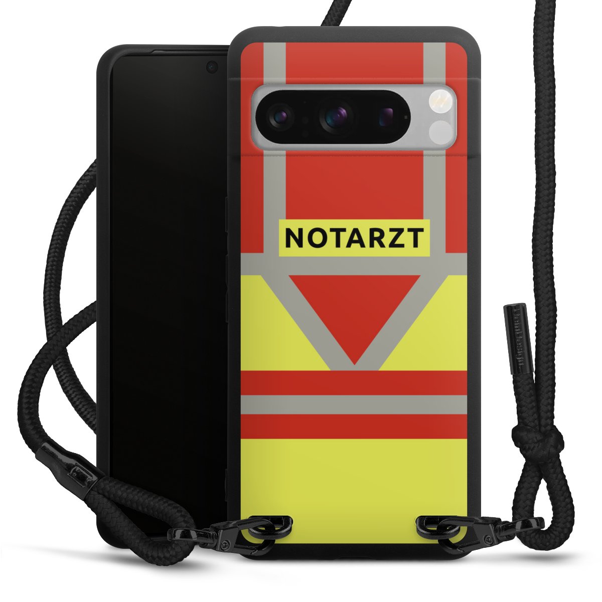 Pure Black: Handyhülle, Stoffband und Metalldetails in stylischem Mattschwarz.