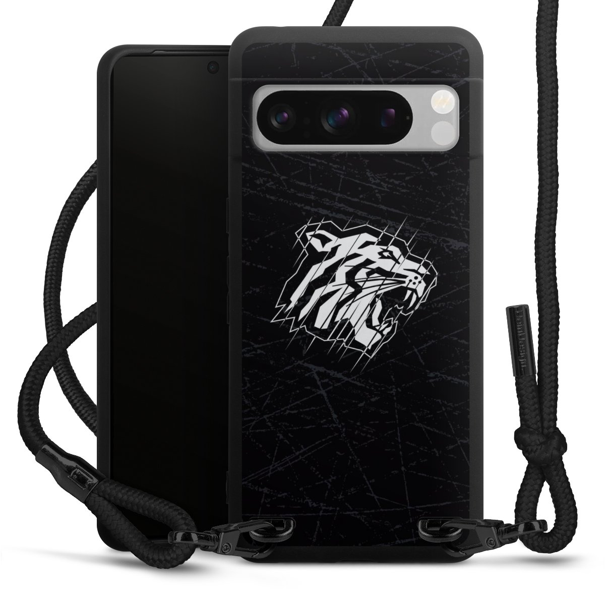 Pure Black: Handyhülle, Stoffband und Metalldetails in stylischem Mattschwarz.