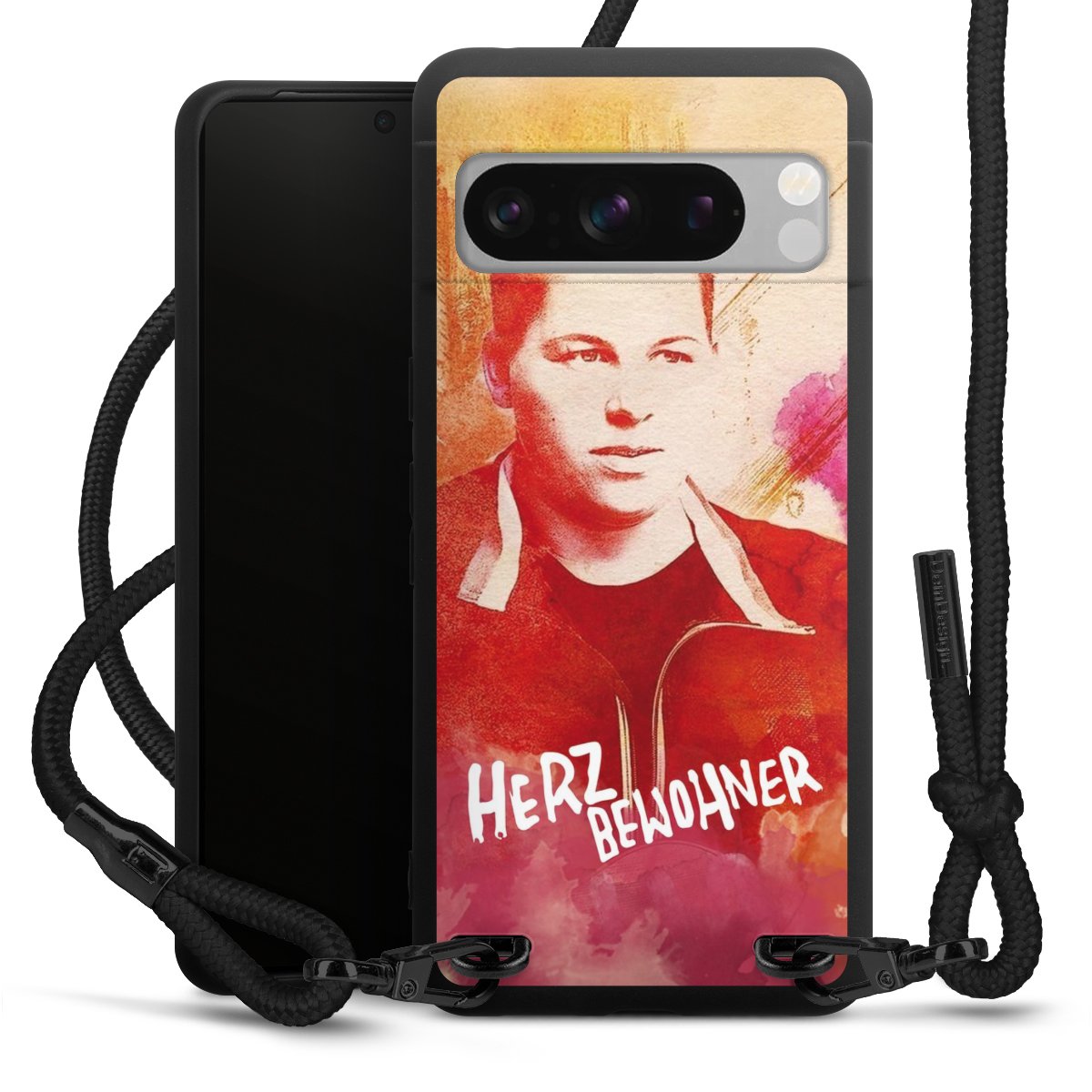 Pure Black: Handyhülle, Stoffband und Metalldetails in stylischem Mattschwarz.