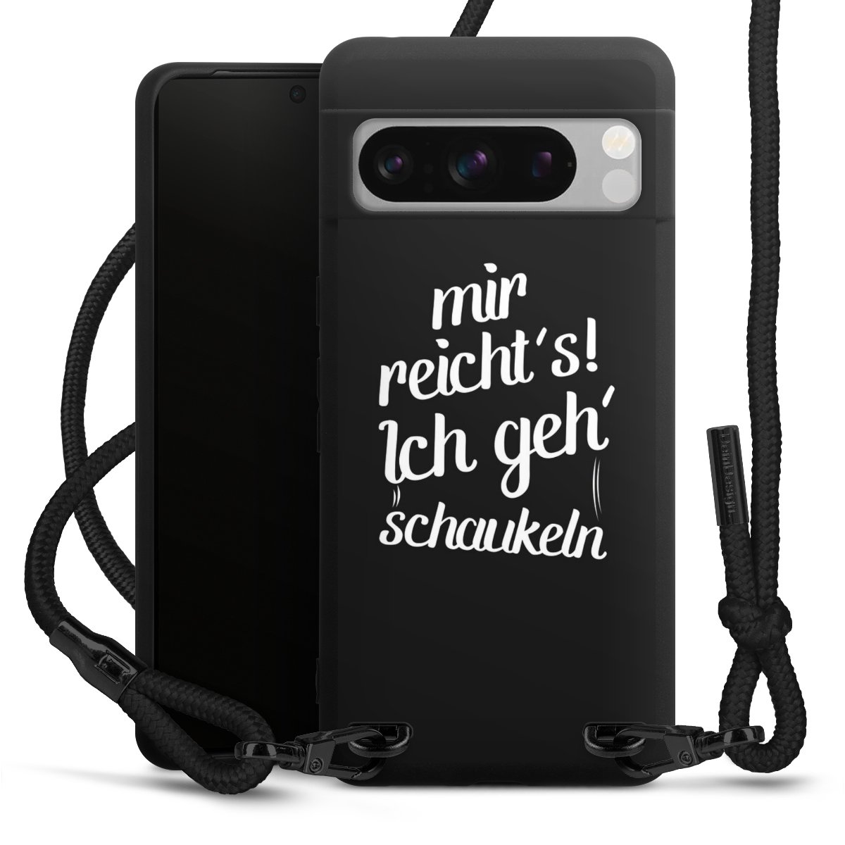 Pure Black: Handyhülle, Stoffband und Metalldetails in stylischem Mattschwarz.
