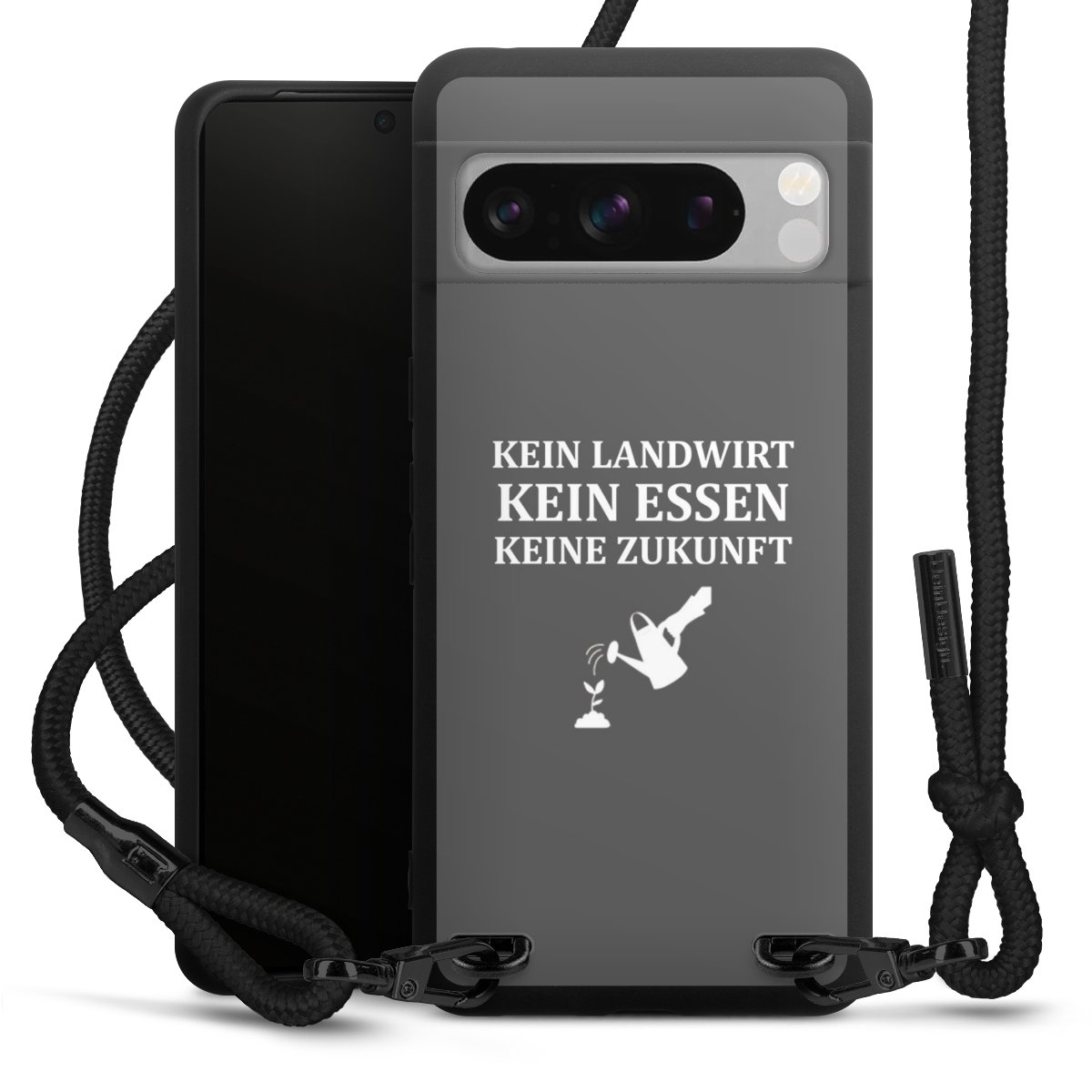 Pure Black: Handyhülle, Stoffband und Metalldetails in stylischem Mattschwarz.