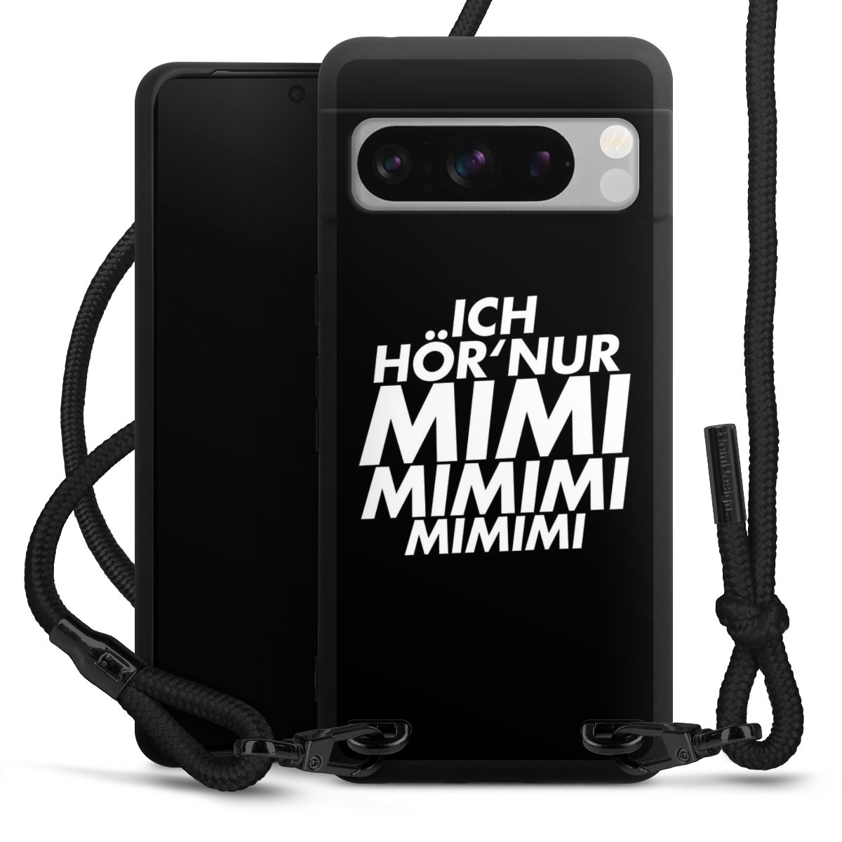 Pure Black: Handyhülle, Stoffband und Metalldetails in stylischem Mattschwarz.