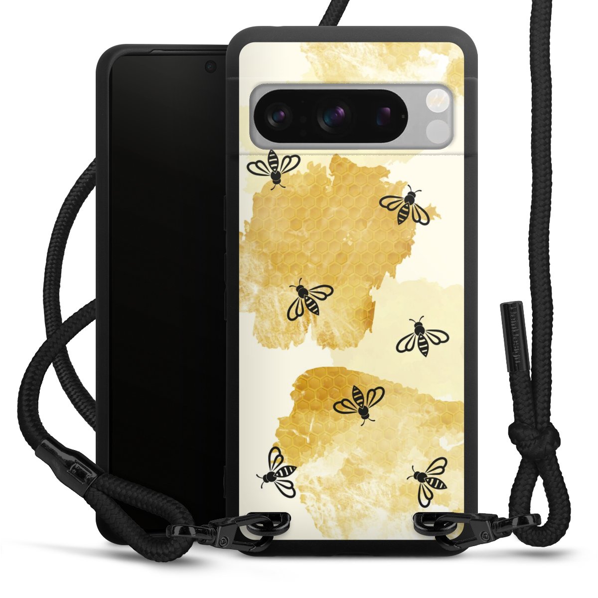 Pure Black: Handyhülle, Stoffband und Metalldetails in stylischem Mattschwarz.