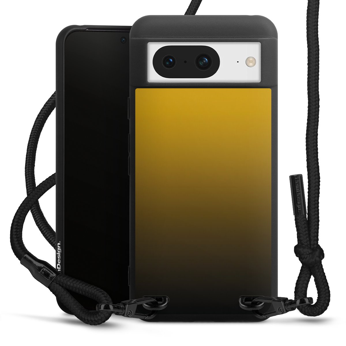 Pure Black: Handyhülle, Stoffband und Metalldetails in stylischem Mattschwarz.