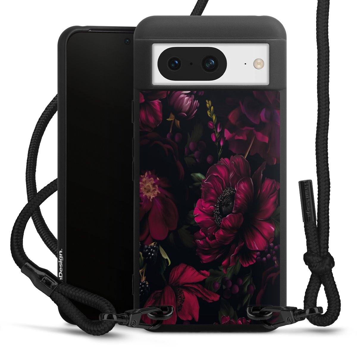Pure Black: Handyhülle, Stoffband und Metalldetails in stylischem Mattschwarz.
