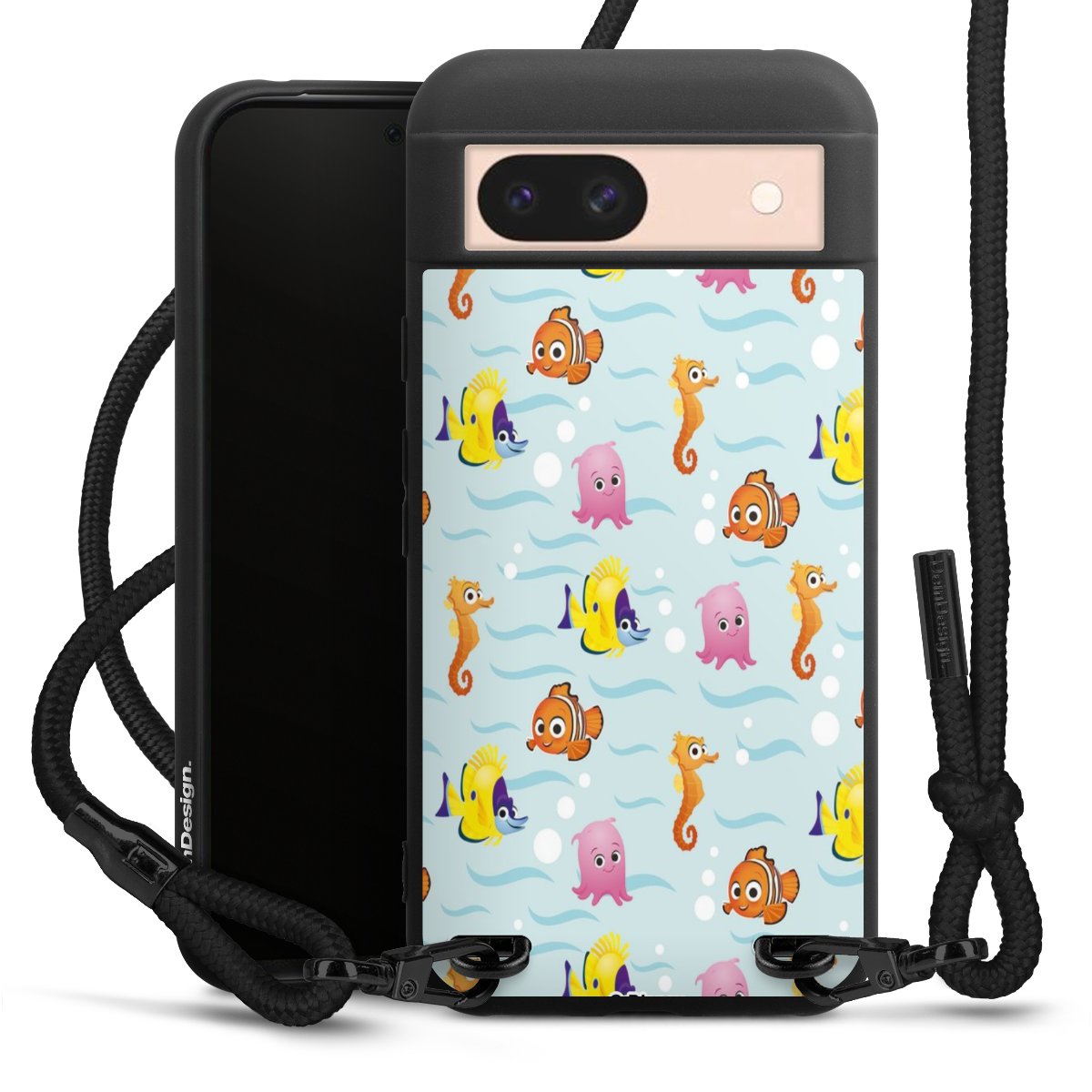 Pure Black: Handyhülle, Stoffband und Metalldetails in stylischem Mattschwarz.