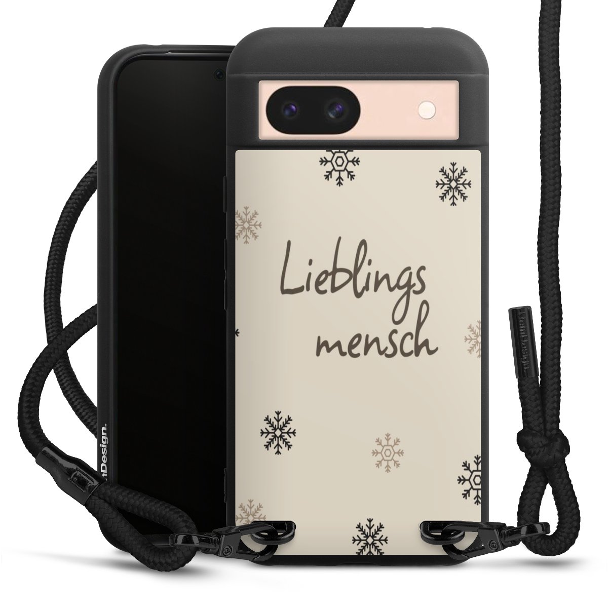Pure Black: Handyhülle, Stoffband und Metalldetails in stylischem Mattschwarz.