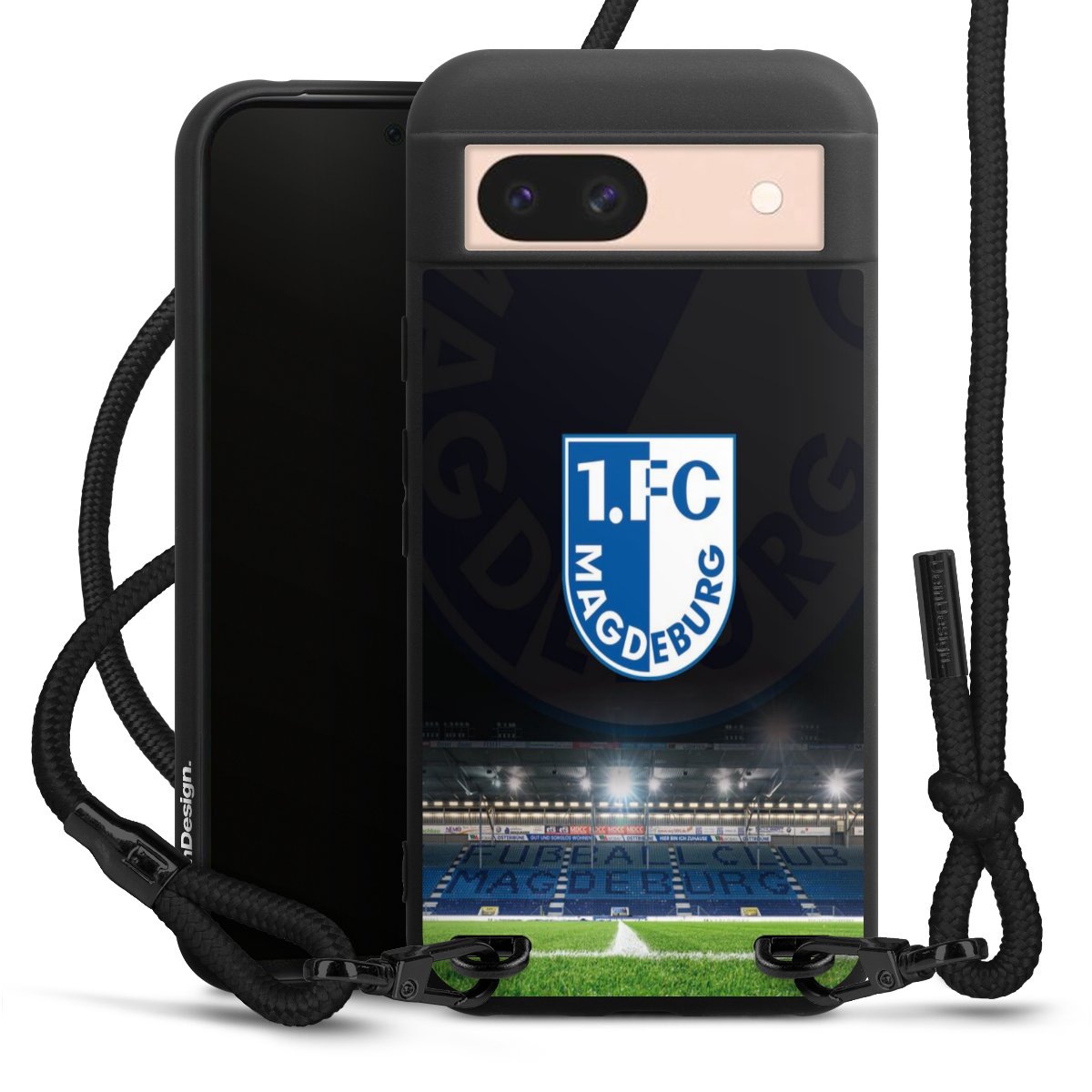 Pure Black: Handyhülle, Stoffband und Metalldetails in stylischem Mattschwarz.