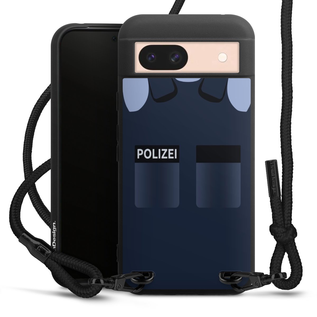 Pure Black: Handyhülle, Stoffband und Metalldetails in stylischem Mattschwarz.