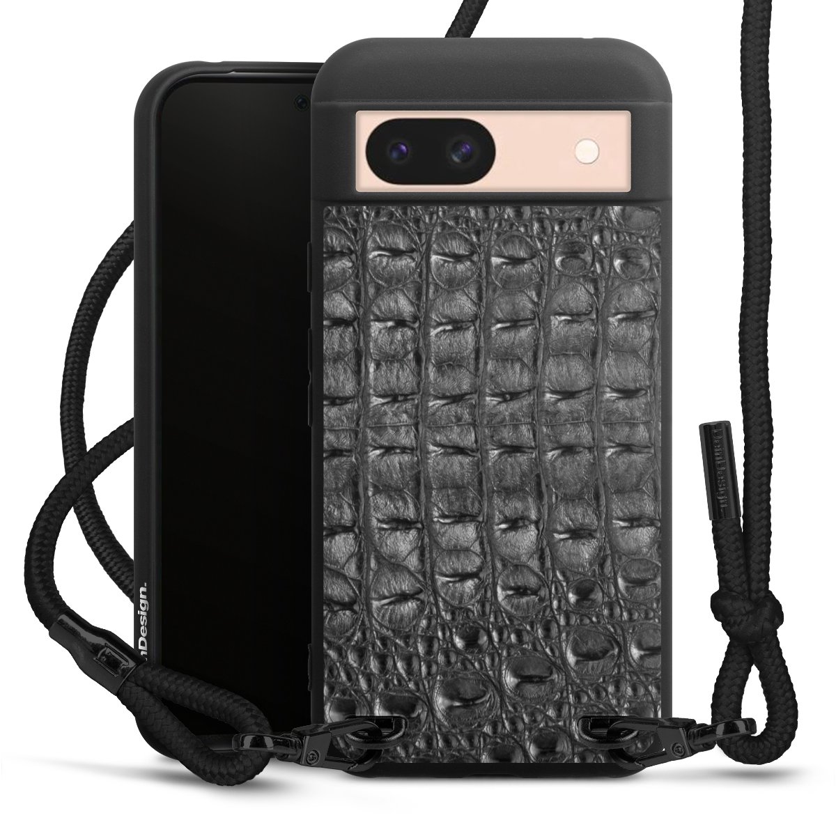 Pure Black: Handyhülle, Stoffband und Metalldetails in stylischem Mattschwarz.