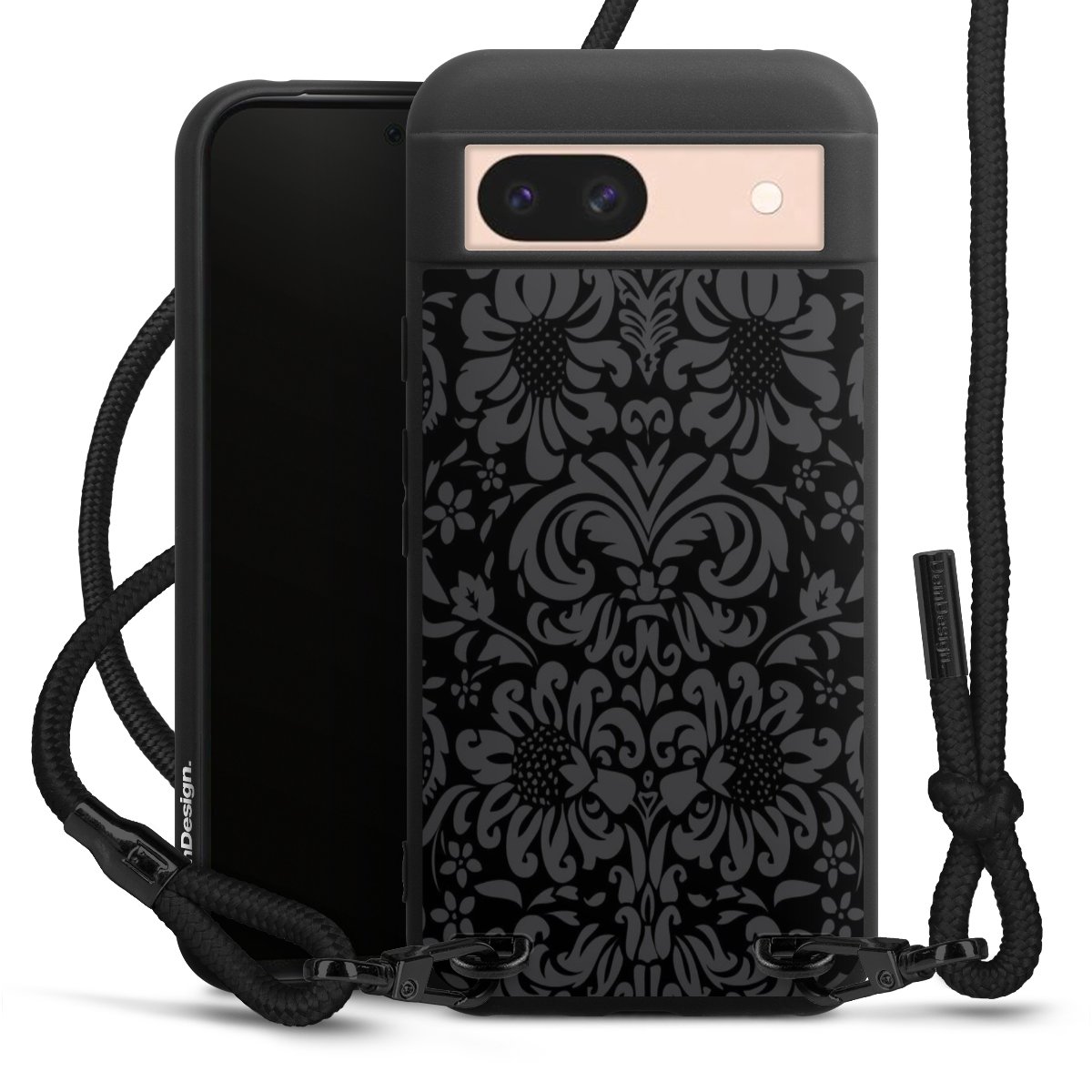 Pure Black: Handyhülle, Stoffband und Metalldetails in stylischem Mattschwarz.