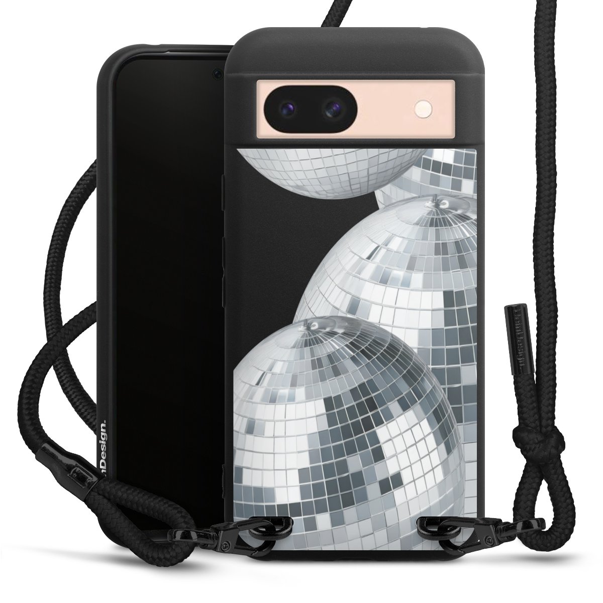 Pure Black: Handyhülle, Stoffband und Metalldetails in stylischem Mattschwarz.