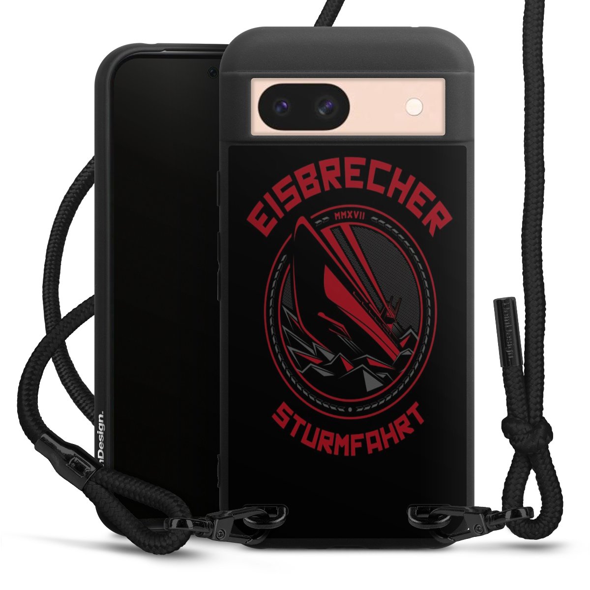 Pure Black: Handyhülle, Stoffband und Metalldetails in stylischem Mattschwarz.