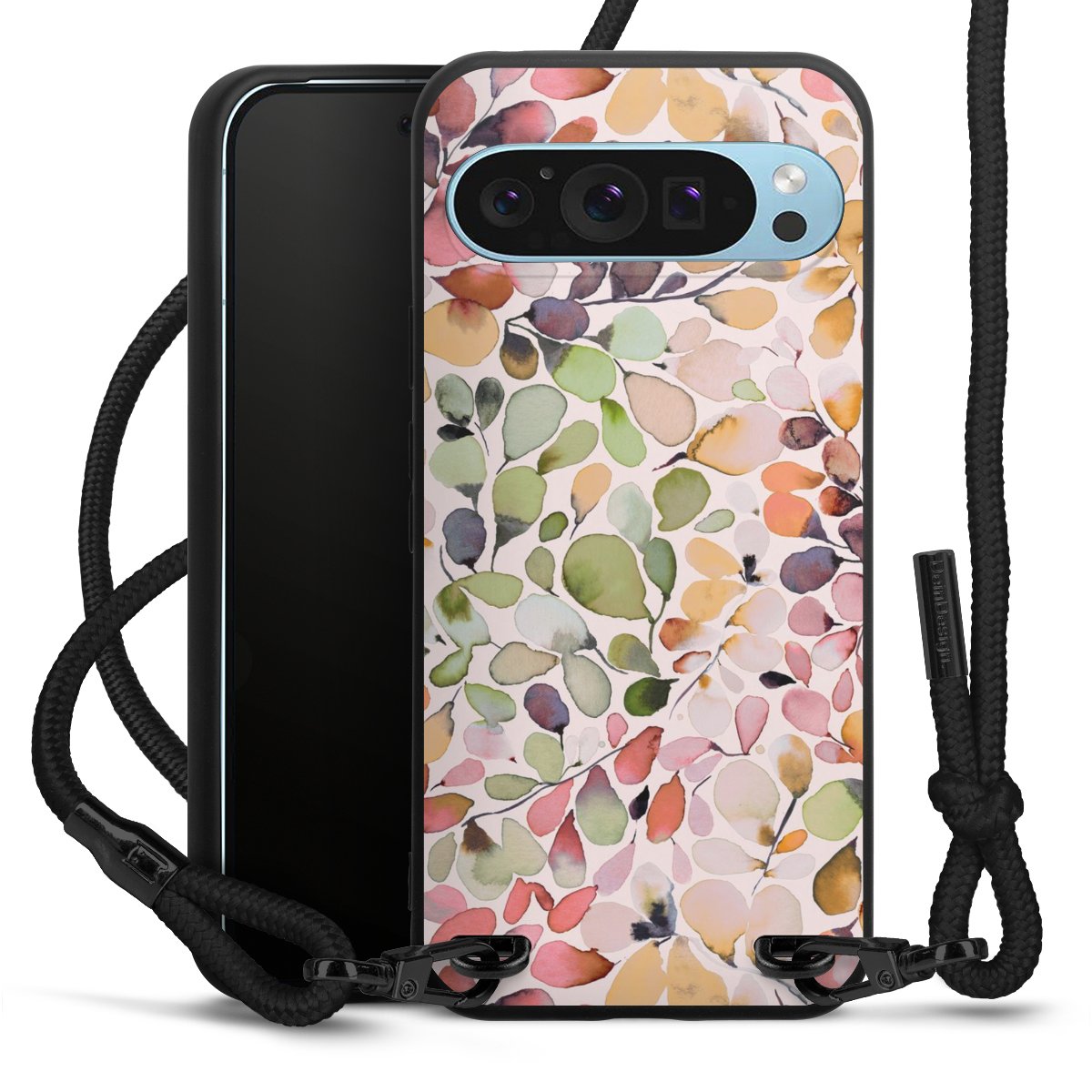 Pure Black: Handyhülle, Stoffband und Metalldetails in stylischem Mattschwarz.