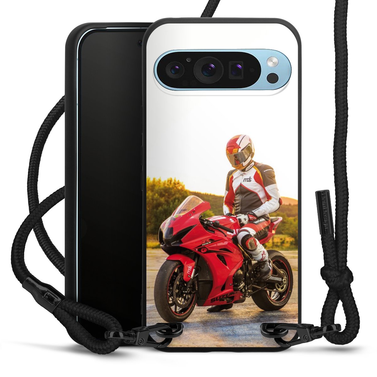 Pure Black: Handyhülle, Stoffband und Metalldetails in stylischem Mattschwarz.