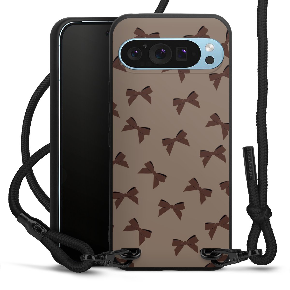 Pure Black: Handyhülle, Stoffband und Metalldetails in stylischem Mattschwarz.