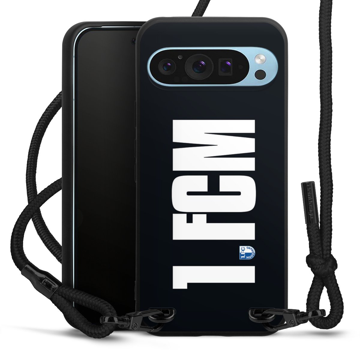 Pure Black: Handyhülle, Stoffband und Metalldetails in stylischem Mattschwarz.