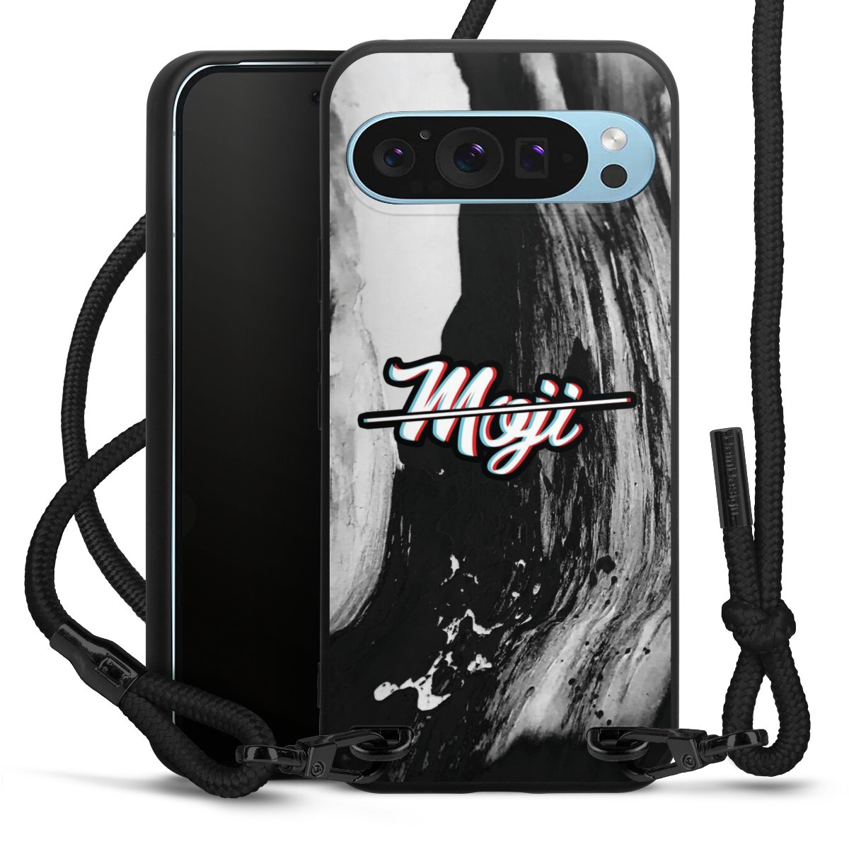 Pure Black: Handyhülle, Stoffband und Metalldetails in stylischem Mattschwarz.