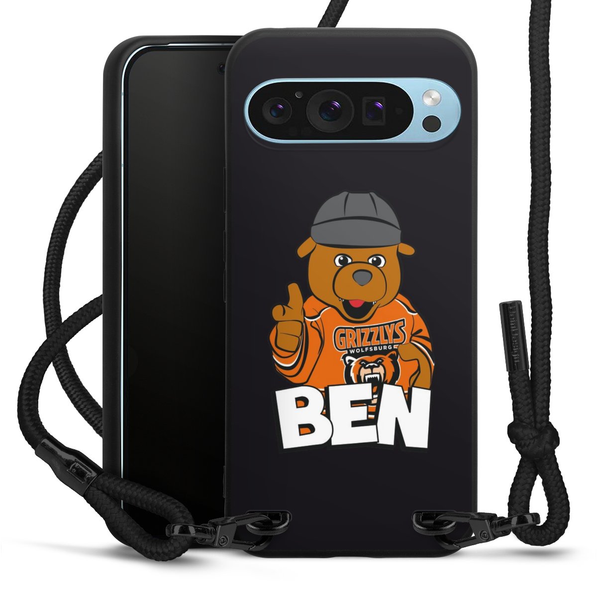 Pure Black: Handyhülle, Stoffband und Metalldetails in stylischem Mattschwarz.