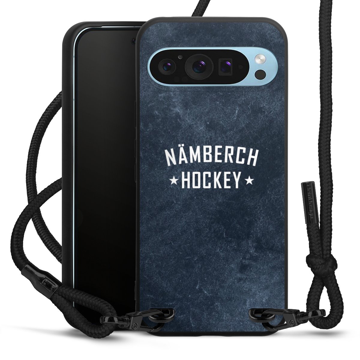 Pure Black: Handyhülle, Stoffband und Metalldetails in stylischem Mattschwarz.