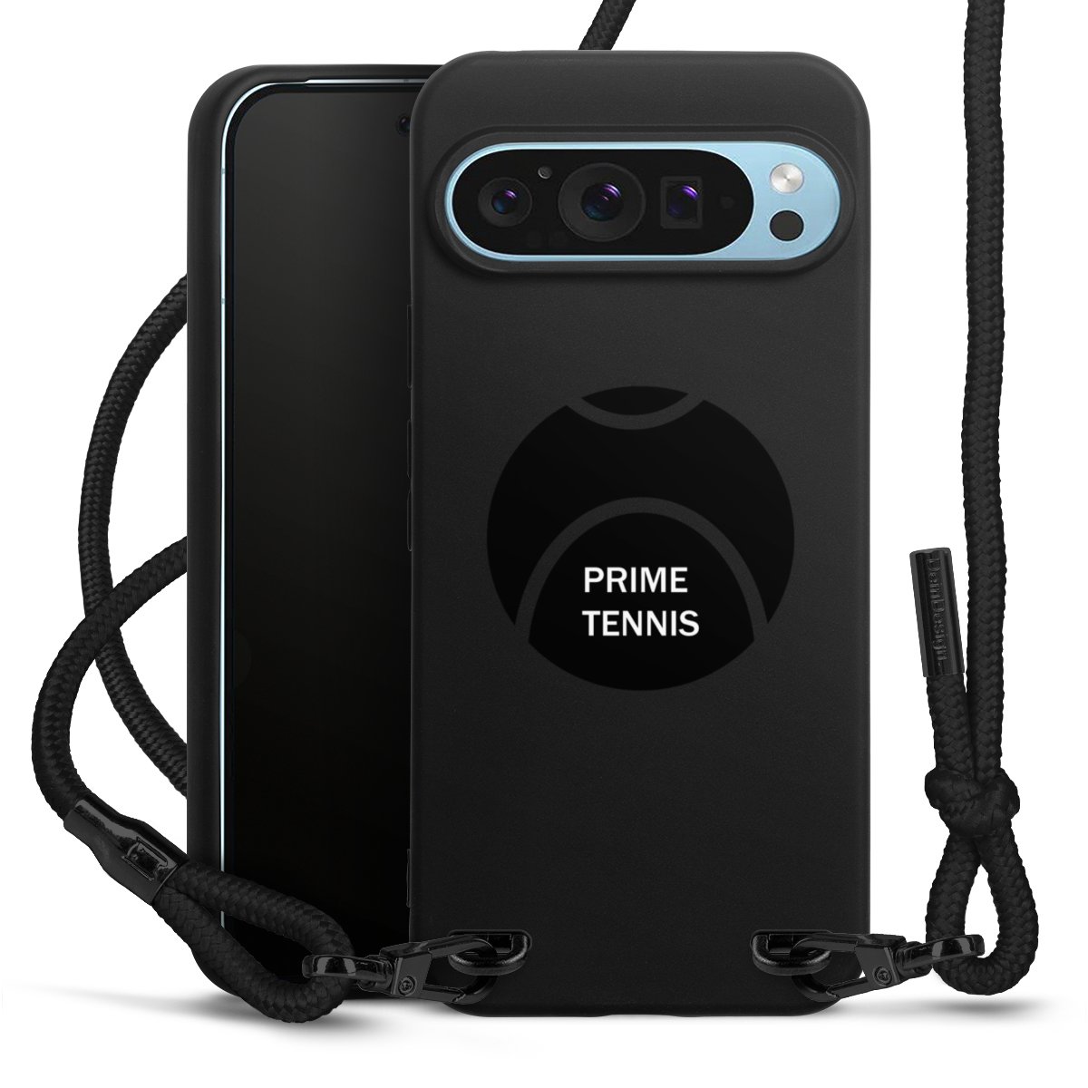 Pure Black: Handyhülle, Stoffband und Metalldetails in stylischem Mattschwarz.