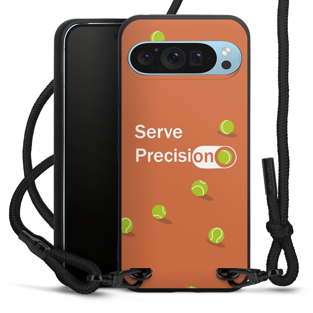 Pure Black: Handyhülle, Stoffband und Metalldetails in stylischem Mattschwarz.