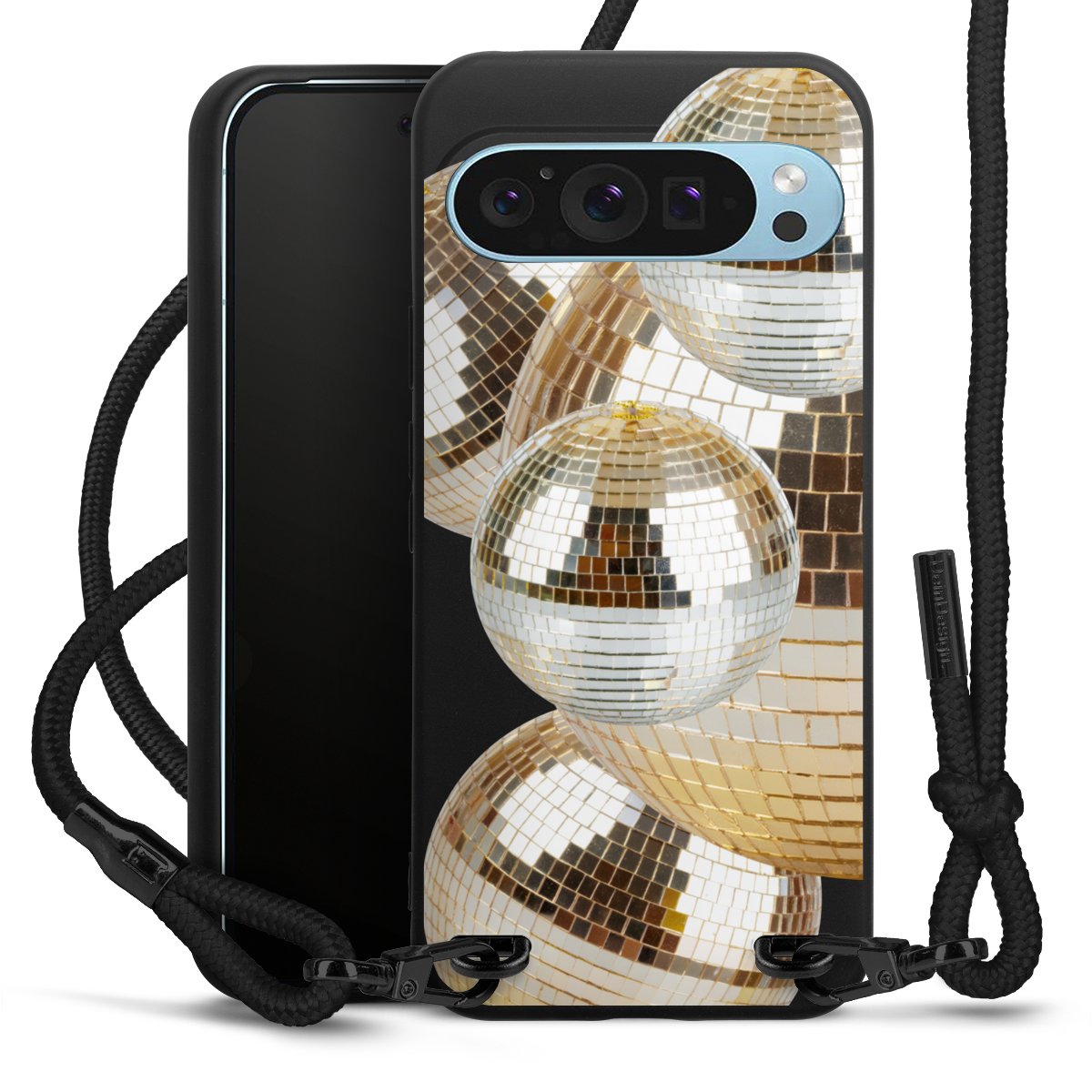 Pure Black: Handyhülle, Stoffband und Metalldetails in stylischem Mattschwarz.