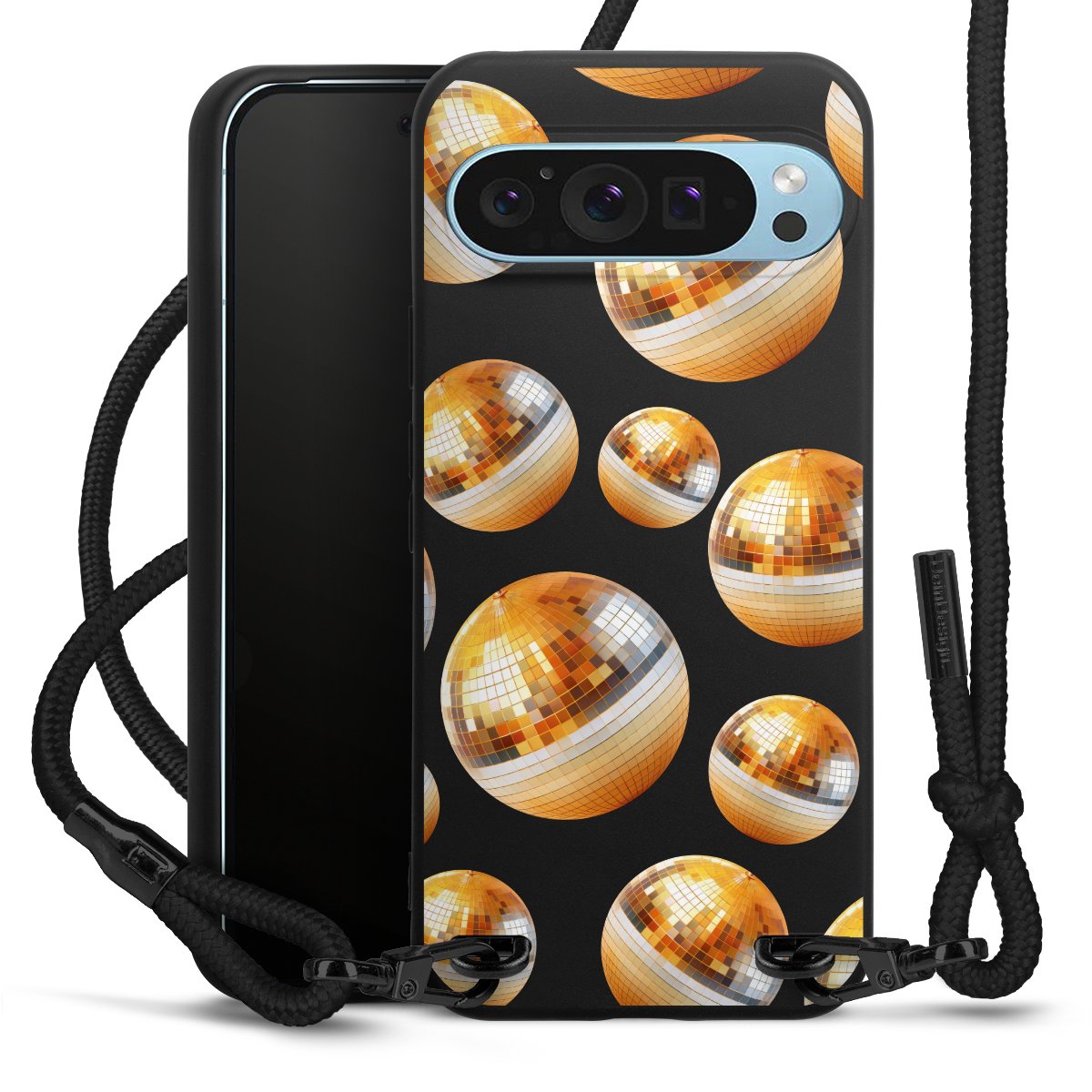 Pure Black: Handyhülle, Stoffband und Metalldetails in stylischem Mattschwarz.