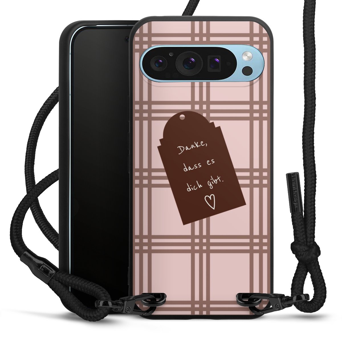 Pure Black: Handyhülle, Stoffband und Metalldetails in stylischem Mattschwarz.