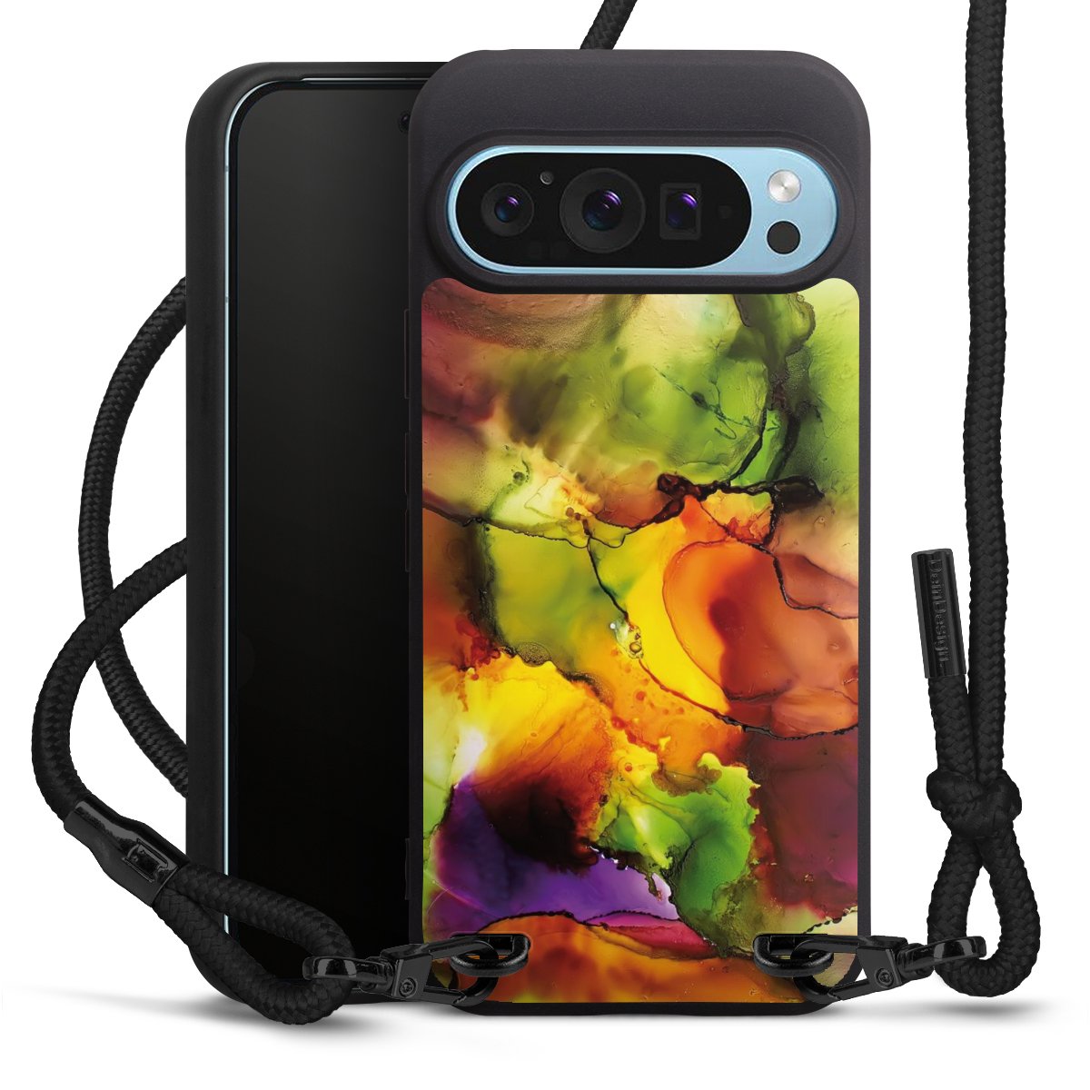 Pure Black: Handyhülle, Stoffband und Metalldetails in stylischem Mattschwarz.